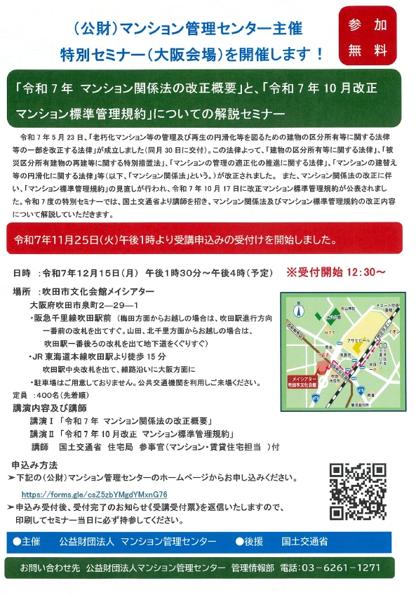 「令和7年 マンション関係法の改正概要」と、「令和7年10月改正マンション標準管理規約」についての解説セミナー 2025.11.012025.11.26 特別セミナー(大阪会場)「令和7年 マンション関係法の改正概要」と、「令和7年10月改正マンション標準管理規約」についての解説セミナー日時2025年12月15日(月)13:30開演場所中ホール入場料無料(事前申し込み制)主催公益財団法人マンション管理センター 後援:国土交通省お問い合わせ先公益財団法人 マンション管理センター管理情報部:03-6261-1271 チラシPDFダウンロード 公益財団法人マンション管理センター公式サイト URL Copied!