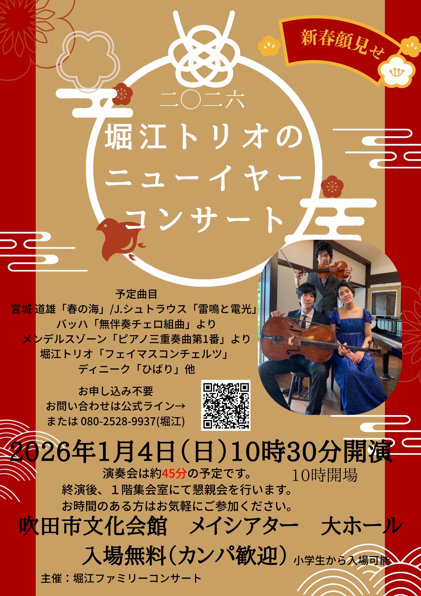 堀江トリオのニューイヤーコンサート 2025.12.01 堀江トリオのニューイヤーコンサート日時2026年1月4日(日)10:30開演場所大ホール入場料無料(申込不要・先着1300名)主催堀江ファミリーコンサートお問い合わせ先堀江:080-2528-9937チラシPDFダウンロード URL Copied!