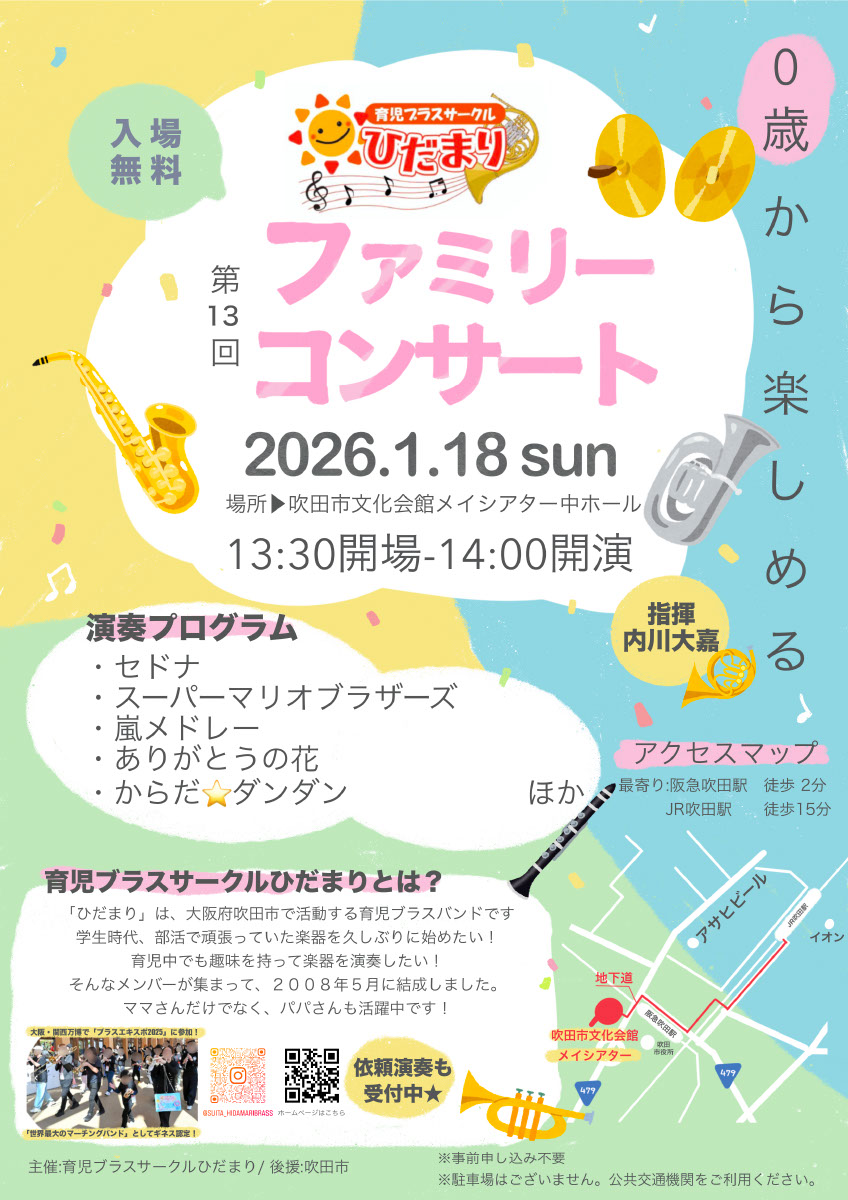 育児ブラスサークルひだまり 第13回ファミリーコンサート 2025.12.10 育児ブラスサークルひだまり 第13回ファミリーコンサート日時2026年1月18日(日)14:00開演場所中ホール入場料無料主催育児ブラスサークルひだまり 育児ブラスサークルひだまり公式サイト URL Copied!