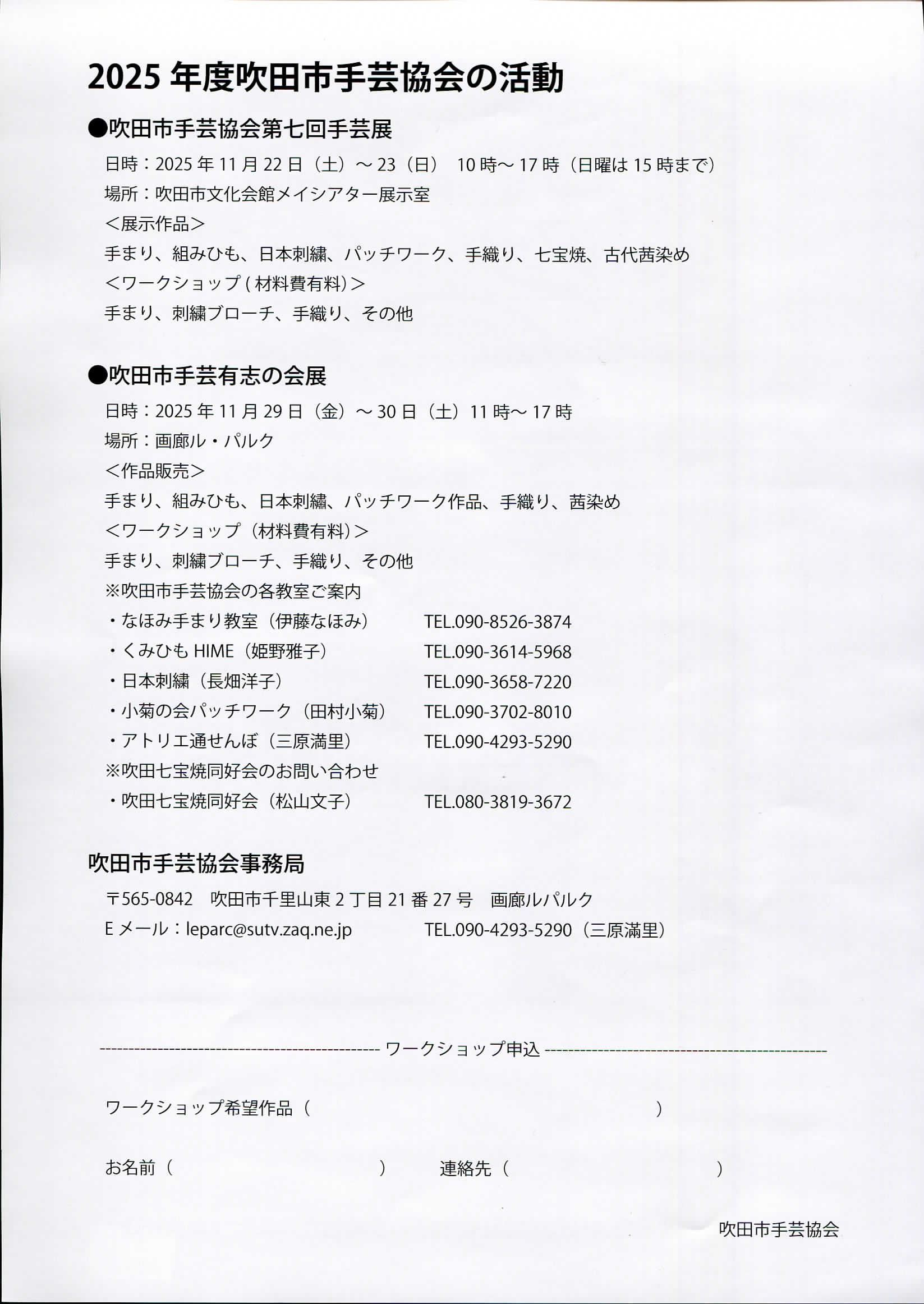 吹田七宝焼同好会 松山:06-6876-4302  吹田市手芸協会 三原:06-6387-9499