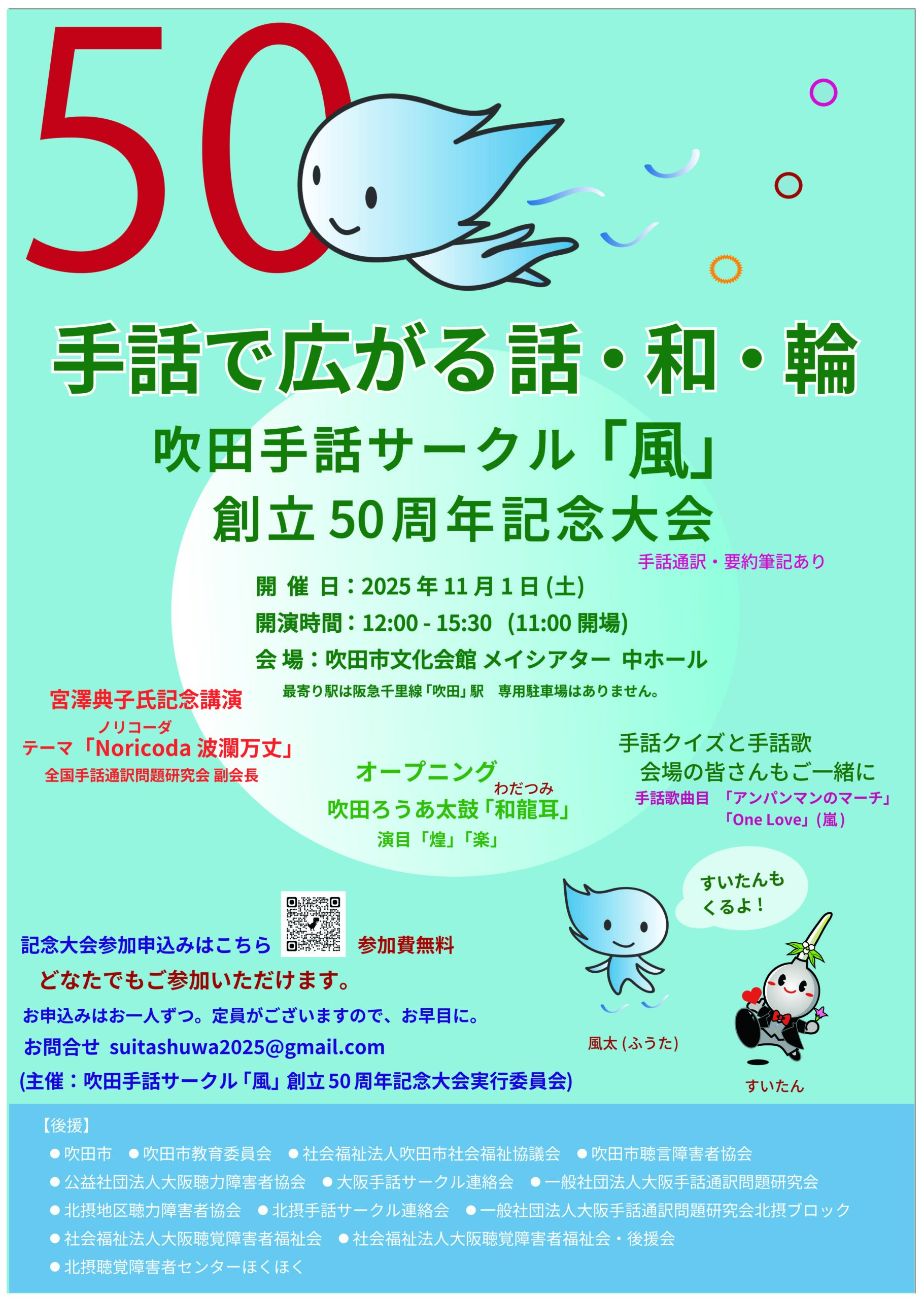 手話で広がる話・和・輪 2025.10.13 吹田手話サークル「風」創立50周年記念大会手話で広がる話・和・輪日時2025年11月1日(土)12:00開演場所中ホール入場料無料主催吹田手話サークル「風」お問い合わせ先suitashuwa2025@gmail.comチラシPDFダウンロード URL Copied!