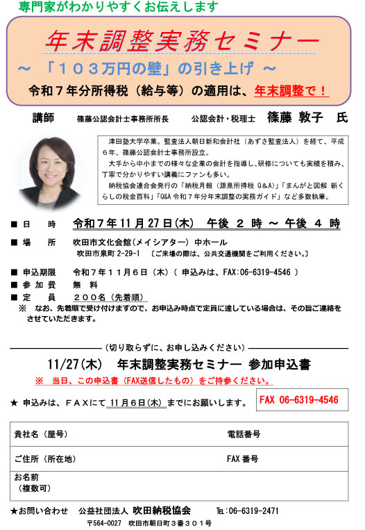 年末調整実務セミナー ~「103万円の壁」の引き上げ~ 2025.10.15 年末調整実務セミナー ~「103万円の壁」の引き上げ~日時2025年11月27日(木)14:00開演場所メイシアター中ホール入場料無料(要事前申込) ※定員200名(先着予約順) ※下記「チラシPDF」よりお申込みください主催公益社団法人吹田納税協会 (共催)吹田税務署お問い合わせ先公益社団法人吹田納税協会 村松 加奈子:06-6319-2471チラシPDFダウンロード 吹田納税協会行事案内ページはこちらから URL Copied!