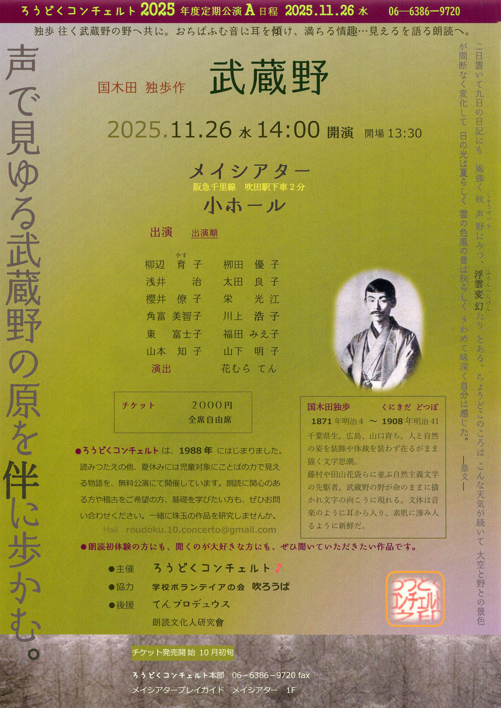 武蔵野 2025.10.18 ろうどくコンチェルト 2025年度定期公演A日程武蔵野日時2025年11月26日(水)14:00開演場所小ホール入場料2,000円お問い合わせ先ろうどくコンチェルト 06-6386-9720チラシPDFダウンロード ろうどくコンチェルト公式サイト URL Copied!
