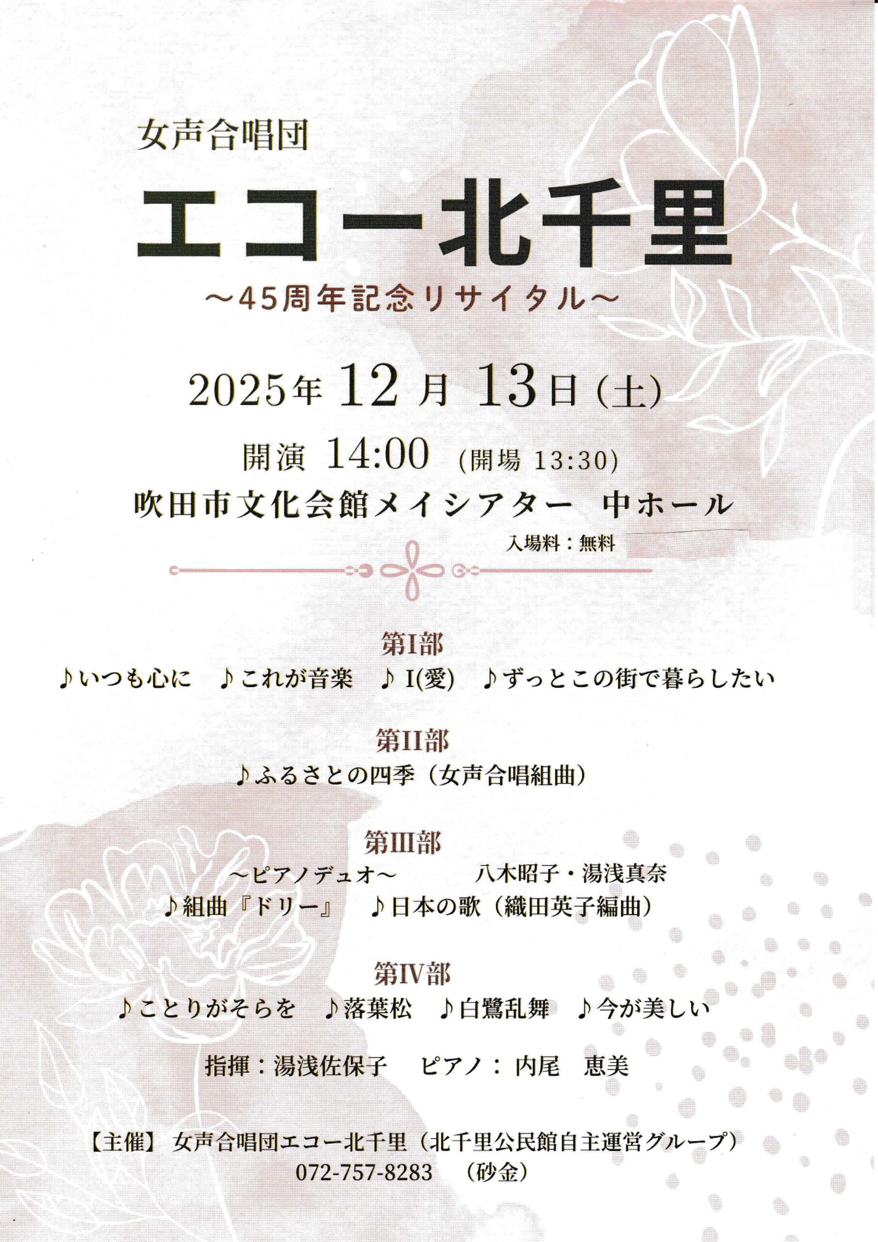 45周年記念リサイタル 2025.10.232025.10.27 女声合唱団エコー北千里45周年記念リサイタル日時2025年12月13日(土)14:00開演場所メイシアター中ホール入場料無料主催エコー北千里お問い合わせ先090-1593-1158チラシPDFダウンロード URL Copied!