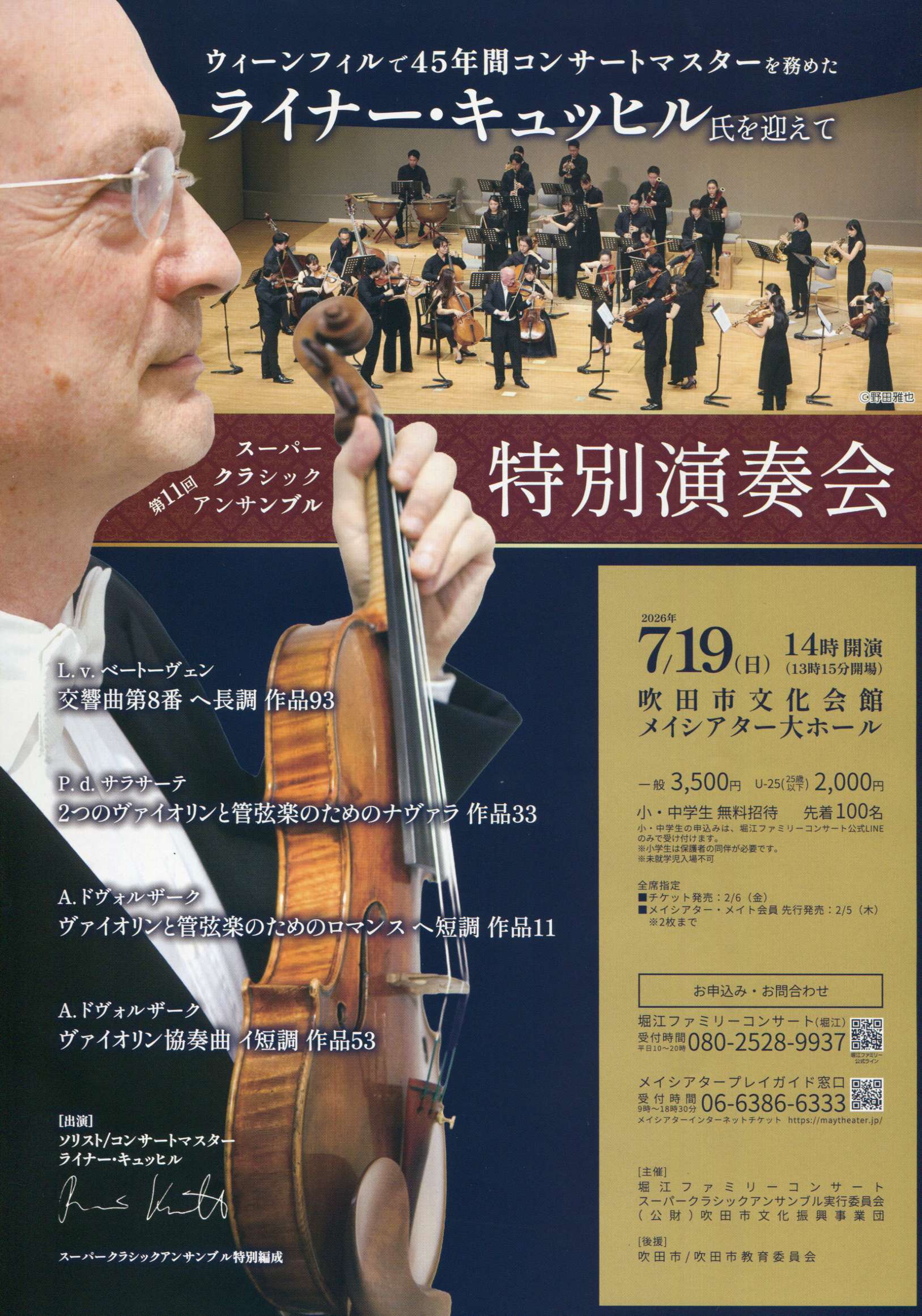 吹田在住のヴァイオリニスト堀江恵太が中心となって結成した若い弦楽器奏者によるアンサンブル「スーパークラシックアンサンブル」が、ウィーン・フィルハーモニー管弦楽団の元コンサートマスターとして多くの巨匠たちとウィーンフィルの音楽の歴史を作り上げてきた、ライナー・キュッヒルと共演!
