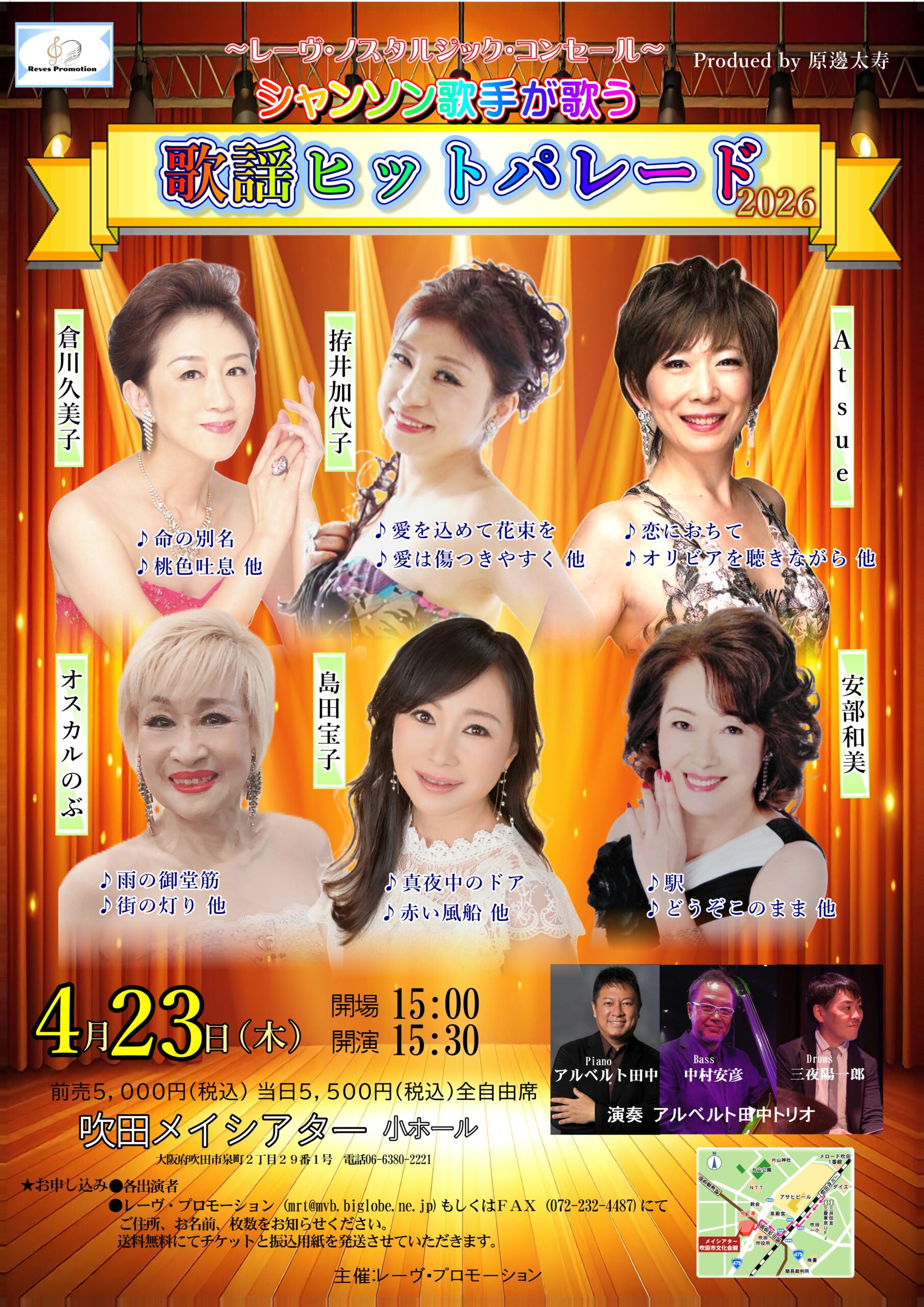シャンソン歌手が歌う 歌謡ヒットパレード2026 2026.02.08 〜レーヴ・ノスタルジック・コンセール〜シャンソン歌手が歌う 歌謡ヒットパレード2026日時2026年4月23日(木)15:30開演場所小ホール入場料・全自由席 前売:5,000円(税込) 当日:5,500円(税込)主催レーヴ・プロモーションお問い合わせ先mail:mrt@mvb.bigobe.ne.jp FAX:072-232-4487 アルベルト田中公式サイト URL Copied!