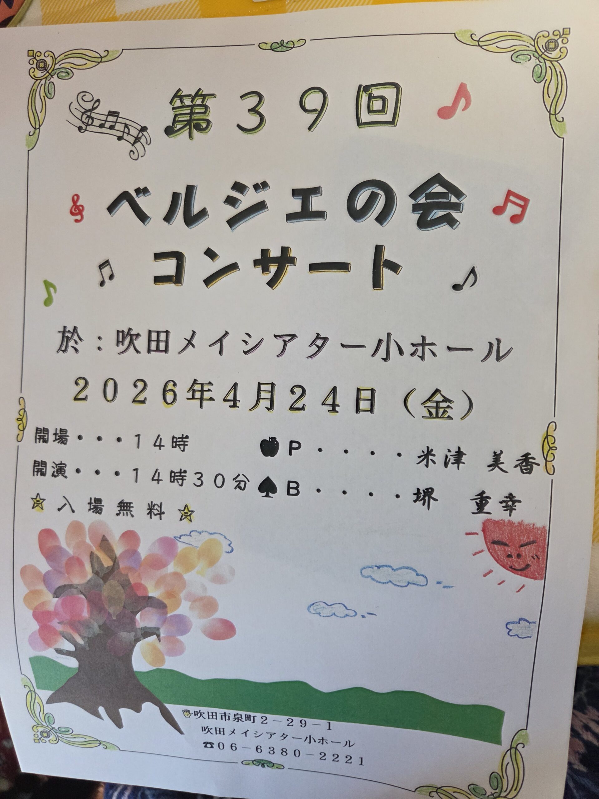 第39回ベルジエの会コンサート 2026.03.12 第39回ベルジエの会コンサート日時2026年04月24日(金)14:30開演場所小ホール入場料無料主催ベルジエの会お問い合わせ先尾本信子:090-8825-0240 URL Copied!