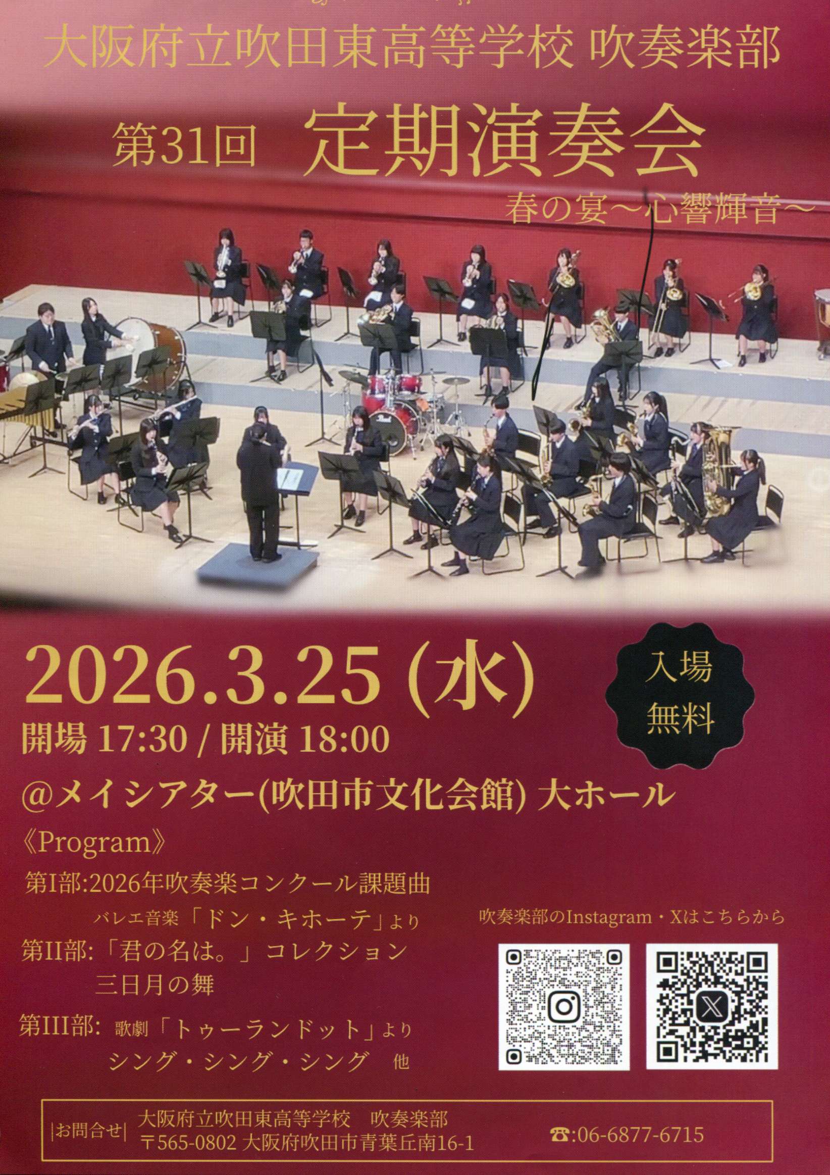 第31回定期演奏会 2026.03.12 大阪府立吹田東高等学校吹奏楽部第31回定期演奏会日時2026年3月25日(水)18:00開演場所大ホール入場料無料主催大阪府立吹田東高等学校吹奏楽部 URL Copied!