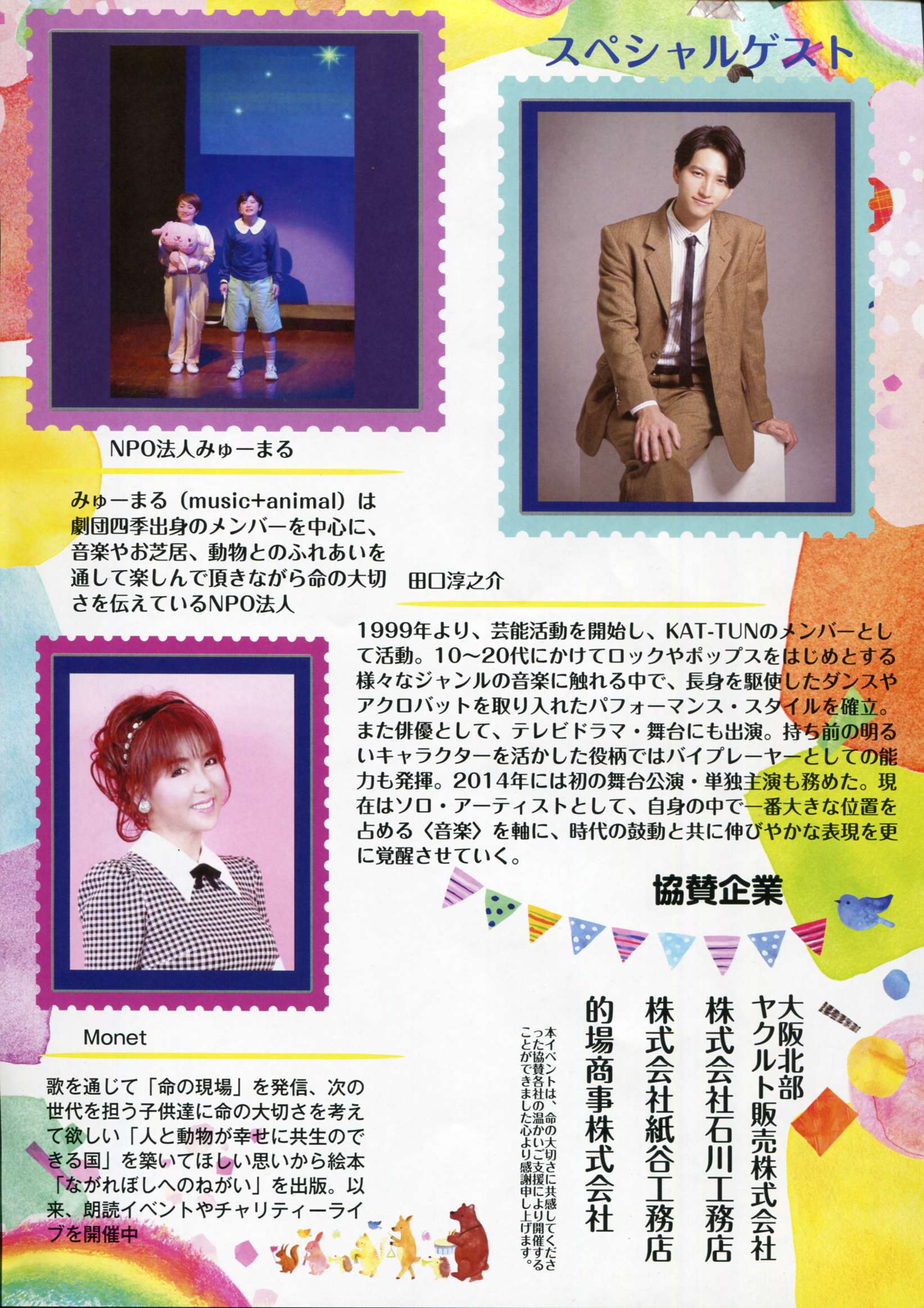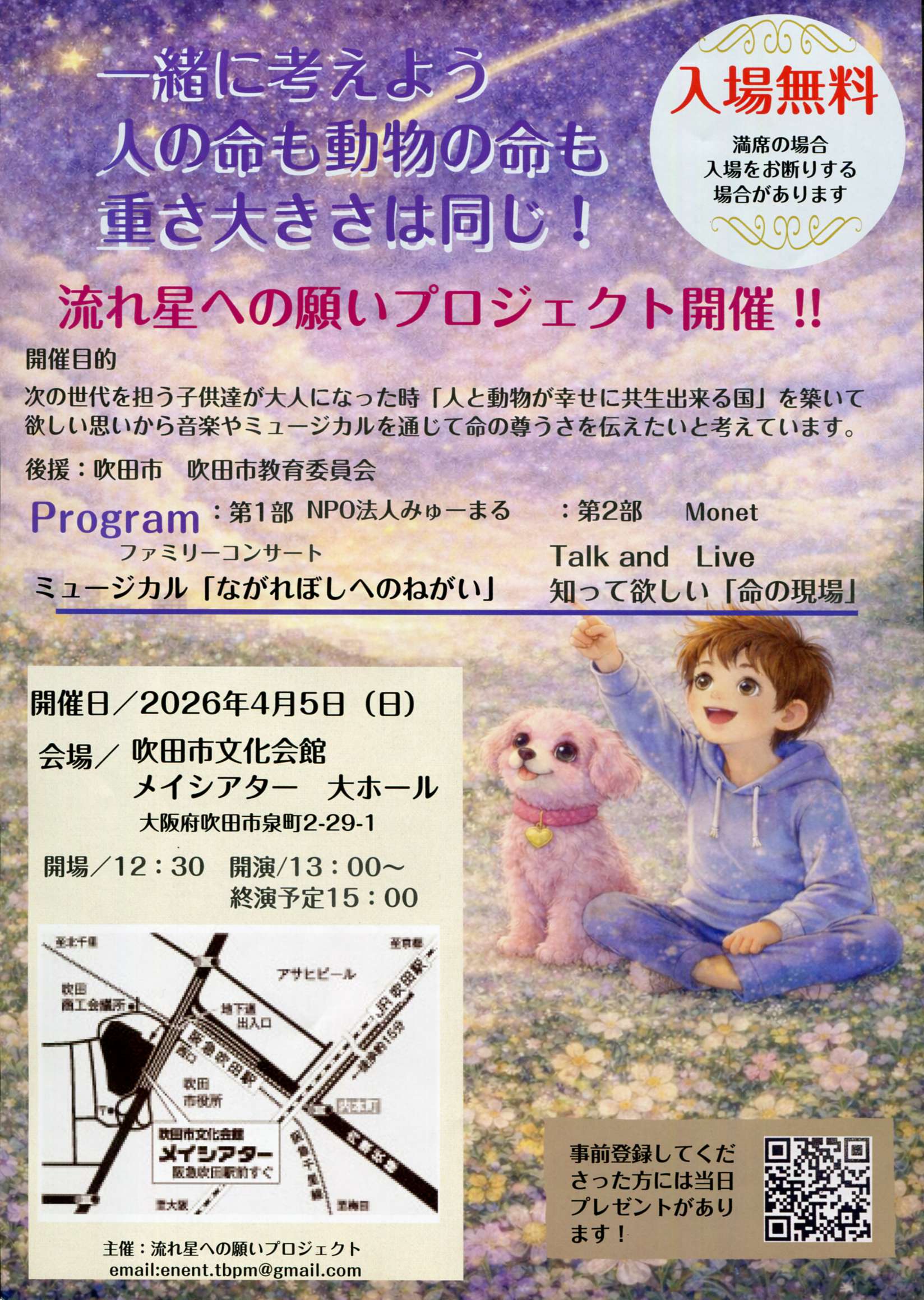 流れ星への願いプロジェクト 2026.03.22 一緒に考えよう人の命も動物の命も重さ大きさは同じ!流れ星への願いプロジェクト日時2026年4月5日(日)13:00開演場所大ホール入場料無料主催流れ星への願いプロジェクト実行委員会チラシPDFダウンロード URL Copied!